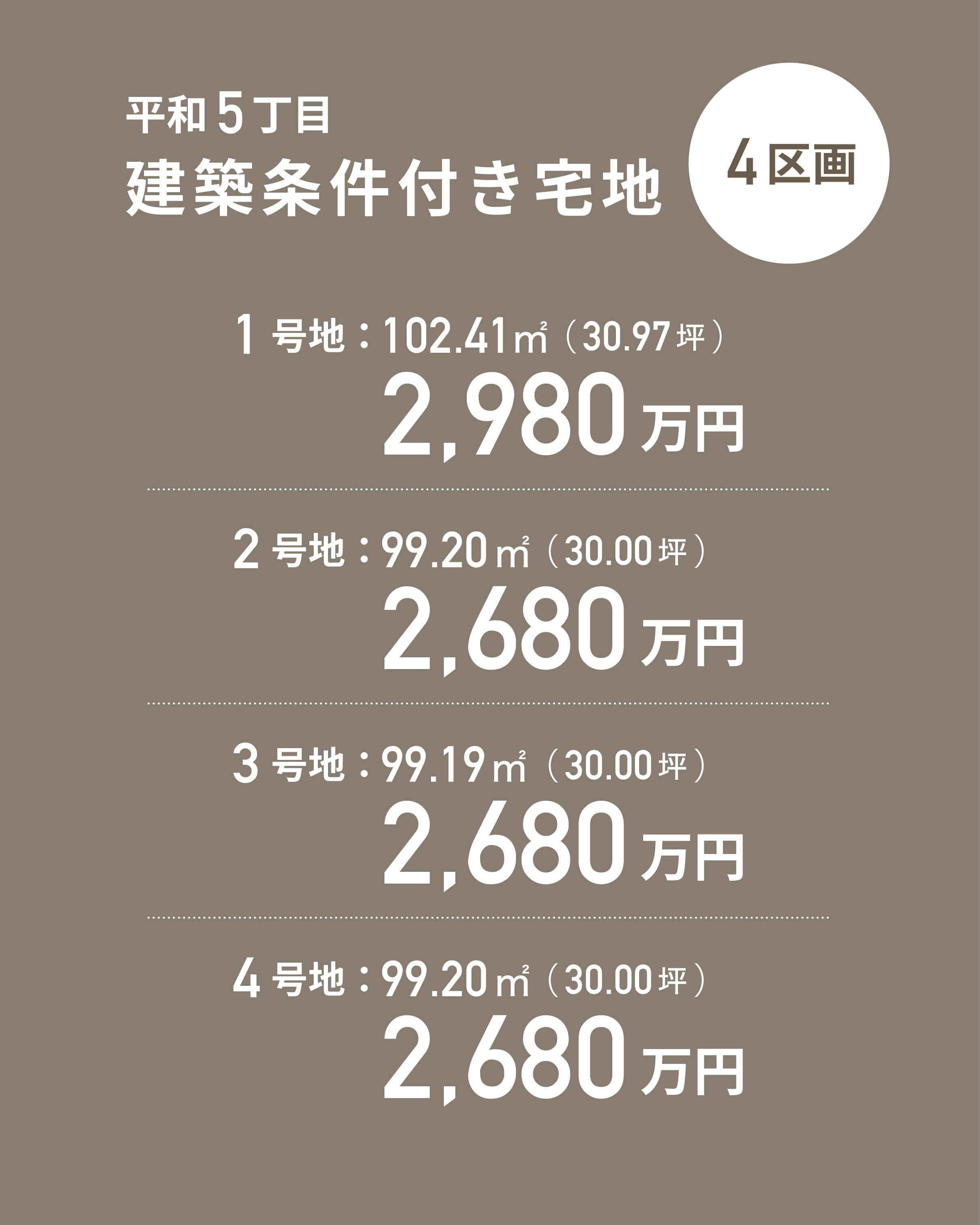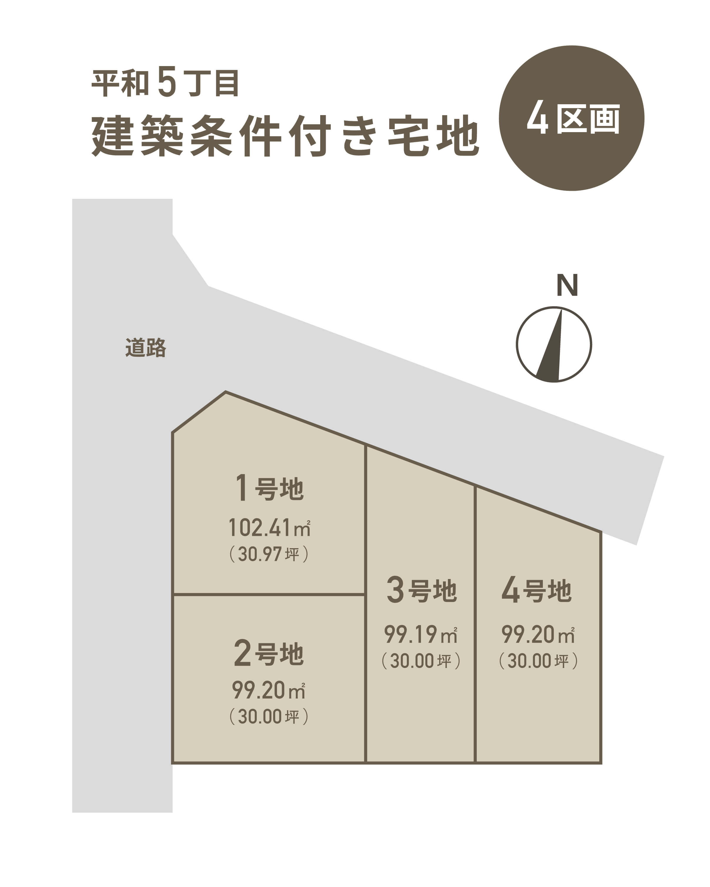 土地面積1号地:102.41㎡(30.97坪)/2号地:99.20㎡(30.00坪)/3号地:99.19㎡(30.00坪)/4号地:99.20㎡(30.00坪)